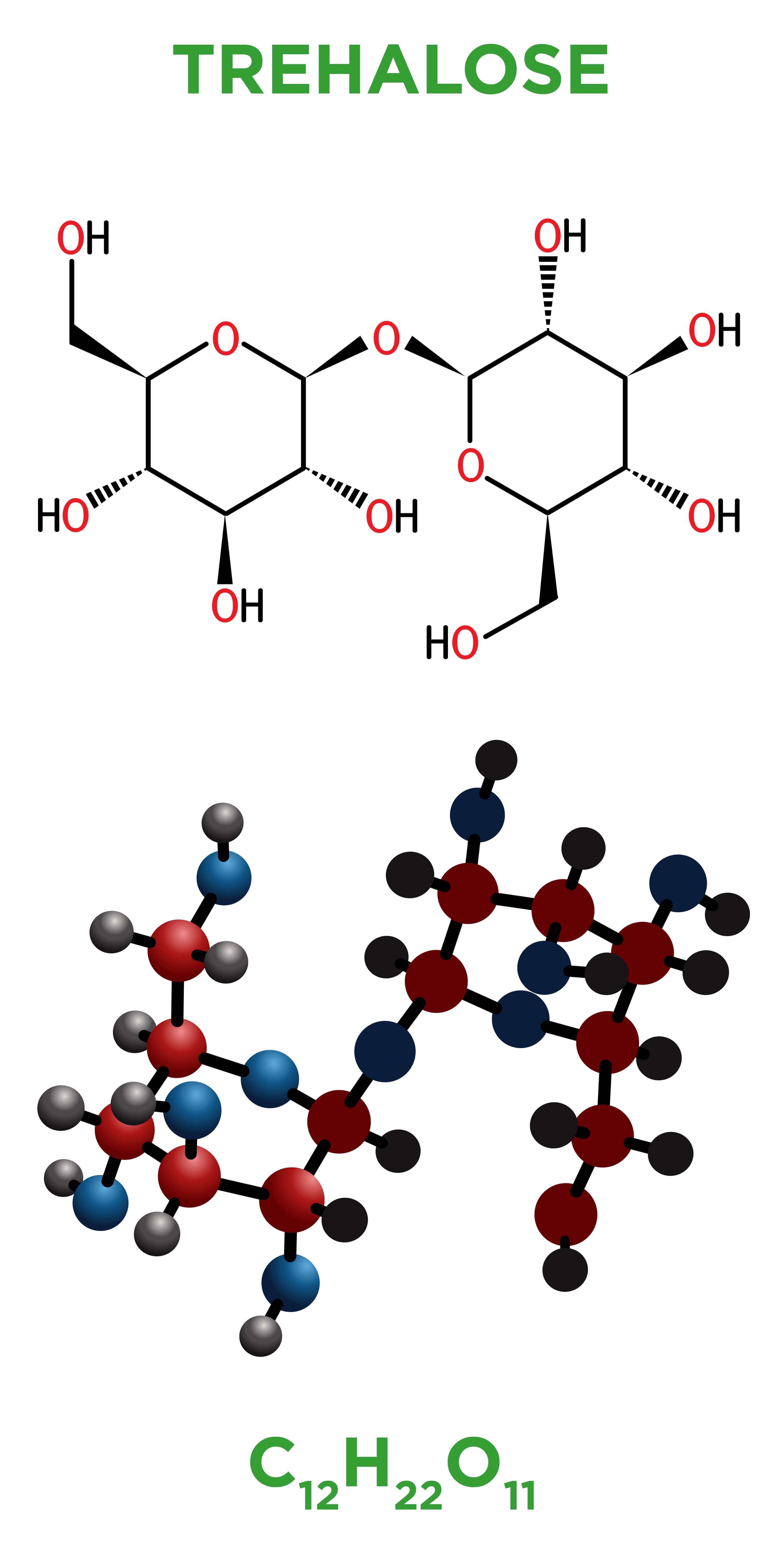 Трегалоза: это дисахарид природного происхождения. Представляет собой кристаллический порошок без цвета и запаха, сладкого вкуса. Легко растворяется в воде. Она обладает замечательными оздоровительными и продлевающими жизнь свойствами.